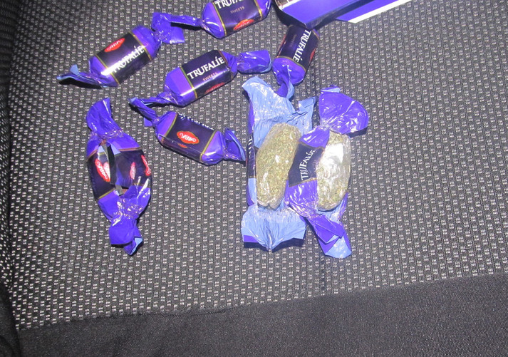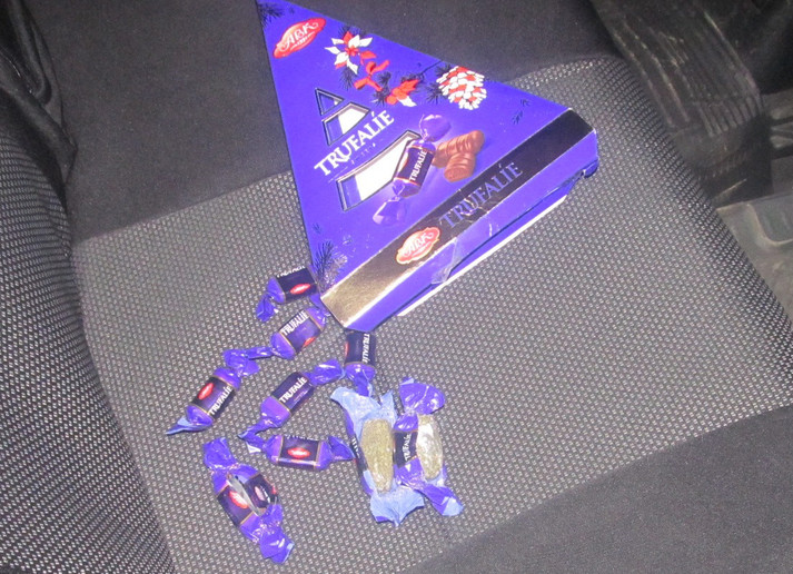 Знаходилися вони в коробці з-під цукерок. Поміж смачних шоколадних солодощів були виявлені і цукерки іншого виробництва. Винахідливий чоловік замотав сіро-зелену речовину, ймовірно марихуану, в обгортки, та таким чином сподівався провезти зілля через кордон.