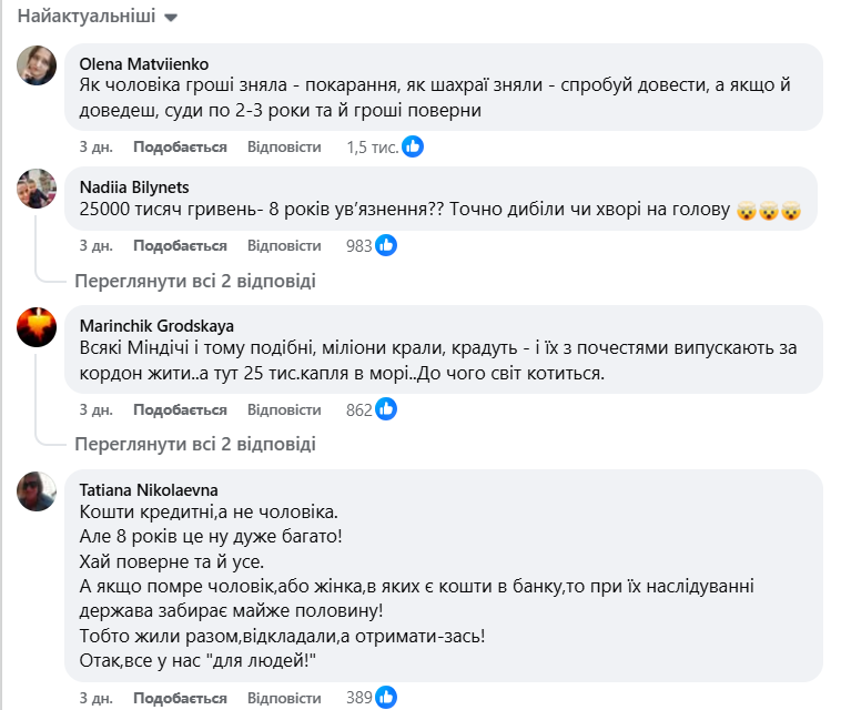 Користувачі масово обурюються можливим строком ув’язнення до восьми років за збиток у 25 тис. грн. У коментарях порівнюють цю справу з корупційними злочинами, де фігурують мільйони, але винні, за словами дописувачів, або уникають покарання, або отримують значно м’якші вироки. Люди пишуть, що в Україні «крадуть мільйони — і живуть за кордоном», тоді як у цій історії, на їхню думку, йдеться про суму, яка не співмірна із загрозою тюремного строку. Дехто прямо називає ситуацію прикладом правової несправедливості та вибіркового правосуддя.