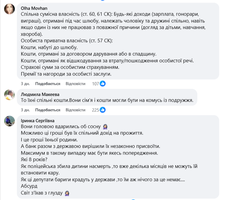 Інша частина коментаторів звертає увагу, що йдеться про подружжя, а кошти могли бути спільними або єдиним джерелом існування для родини. Люди зазначають, що у шлюбі гроші часто належать обом, незалежно від того, на чиє ім’я оформлений рахунок. Також у коментарях звучить думка, що в подібних випадках варто враховувати життєві обставини, а не лише формальні норми закону. Частина користувачів переконана, що максимумом у такій ситуації мало б бути попередження або зобов’язання повернути кошти, а не реальний тюремний строк.