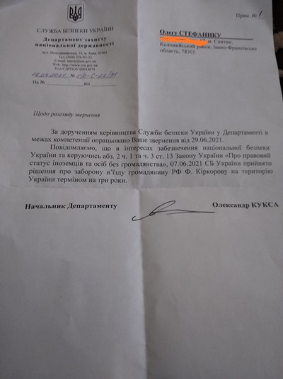«Служба безпеки України заборонила на три роки в’їзд до України Філіпа Кіркорова», – повідомив Стефаник, додавши фото відповіді СБУ на його звернення.