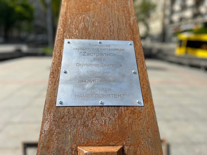 «Історія знає, у військових злочинців є два «путі» – суд або ... Путлер, намек понятен?» – написано на інсталяції.