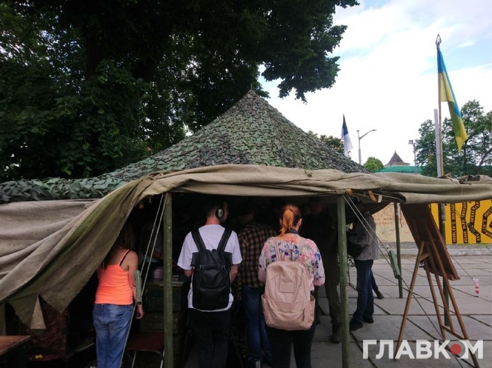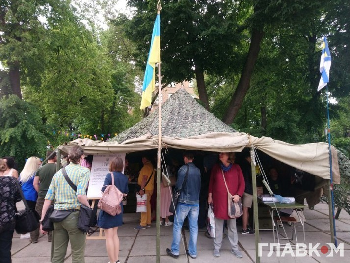 Локацію з ветеранськими книжками оформили в стилі справжнього намету. На «стінах» з брезенту - прапори.