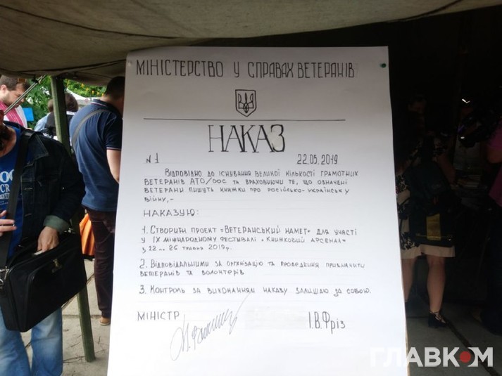 Вперше на фестивалі «Книжковий арсенал», який щорічно проходить у Києві, створено спеціальну локацію для книжок, написаних ветеранами війни на Донбасі. Виставка дістала назву «Ветеранський намет» і була презентована у перший день фестивалю - 22 травня. За словами організаторів, аналогів такої «концентрації» ветеранської літератури в одному місці в Україні поки що немає.