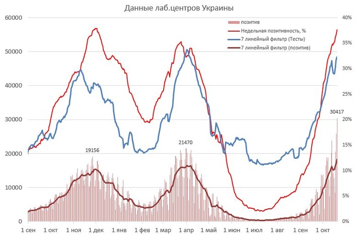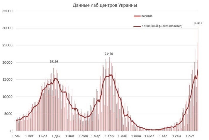 Центр громадського здоров’я ввечері 20 жовтня оприлюднив вражаючі дані лабораторних досліджень. Так, за даними центру, за добу в Україні було отримано понад 30,4 тис. позитивних ПЛР тестів, що на сьогодні є рекордом.