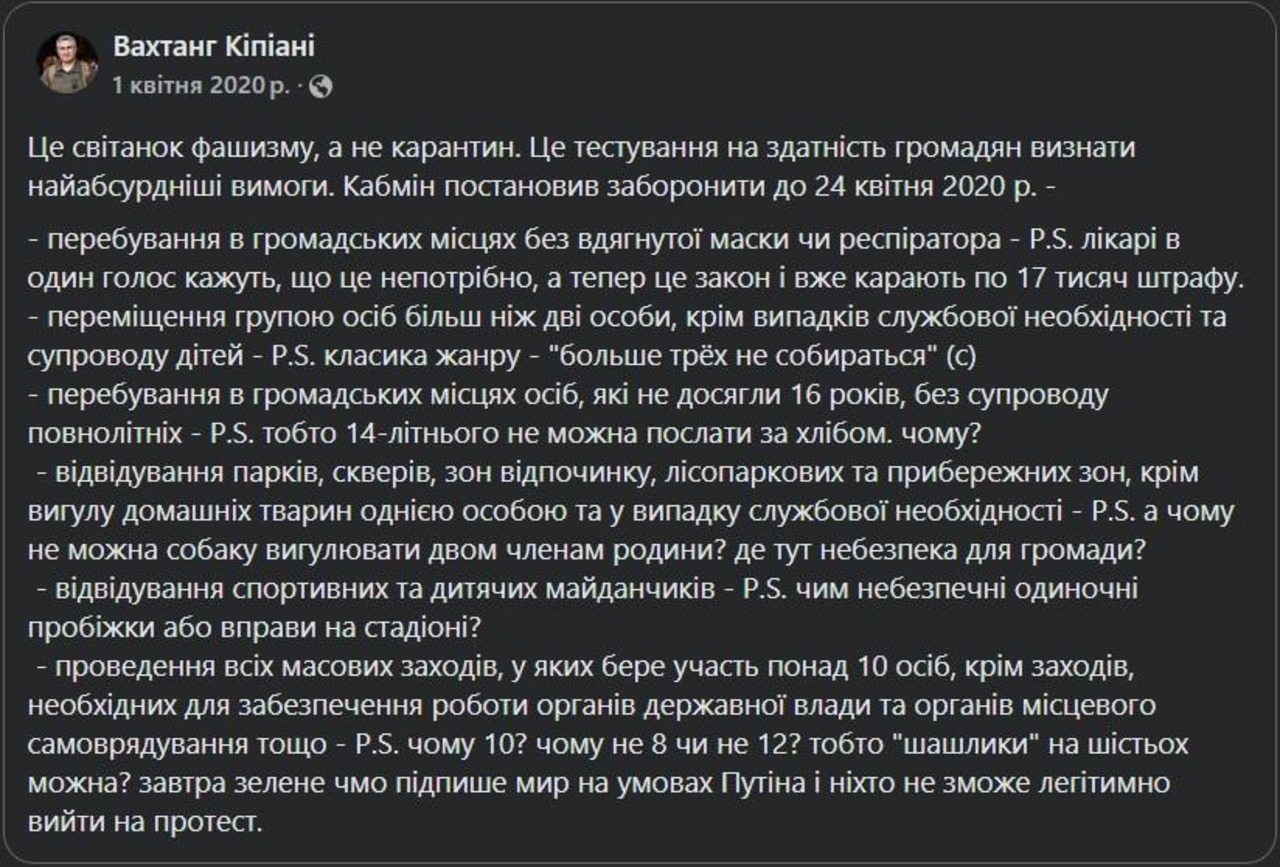 У 2020-му українська влада запровадила карантин спеціальним законом, а у 2023-му його скасувала. Правила карантину були жорсткими та абсурдними. Заборонялось виходити з дому без службової або будь-якої крайньої потреби. Дітям до 16 років не можна було перебувати на вулиці без супроводу дорослих. Водночас дорослі не могли переміщуватися містом у кількості більше двох людей. Під «табу» потрапили навіть парки, сквери та будь-які зони відпочинку – там було заборонено перебувати. Очікувалось, що громадяни цілими днями сидітимуть вдома і так уникнуть інфікування.