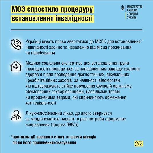 На період дії воєнного стану в Україні спрощено процедуру встановлення та продовження інвалідності. Про це повідомило Міністерство охорони здоров'я.