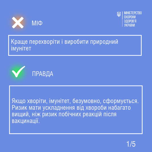 Насправді: Якщо хворіти, імунітет, безумовно, сформується. Але він може коштувати дуже дорого через високий ризик виникнення ускладнень: параліча — від поліомієліту, ураження серця — від дифтерії, пневмонії та ураження мозку — від кору і вітряної віспи. Ризик мати ускладнення перенесеної інфекційної хвороби набагато вищий, ніж ризик побічних реакцій після вакцинації.