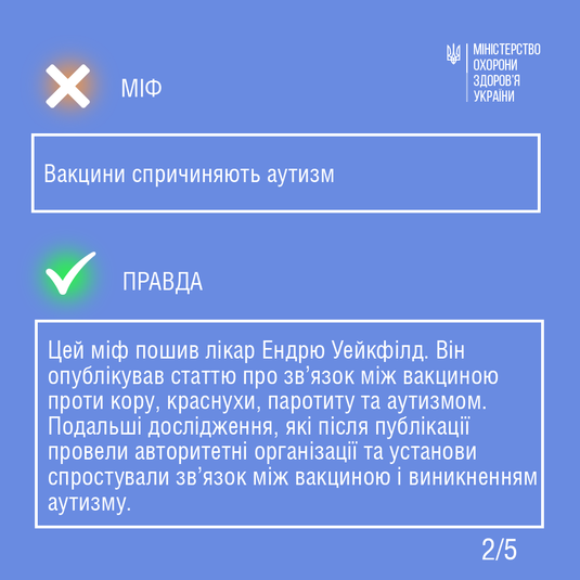Насправді: Це один із найпоширеніших міфів щодо вакцинації. Його витоки беруть початок у 1998 році, коли лікар Ендрю Уейкфілд опублікував статтю про зв’язок між вакциною проти кору, краснухи, паротиту та аутизмом. Але пізніше з’ясувалося, що усі факти, наведені у публікації, сфальшовані. Подальші дослідження, які після публікації провели авторитетні організації та установи (Центр контролю та профілактики захворювань у США (CDC), медичний інститут Національної академії наук Великобританії та британська Національна служба охорони здоров’я), спростували зв’язок між вакциною і виникненням аутизму. Ще понад десяток досліджень і їхні результати спростовують зв’язок між вакцинацією і розвитком аутизму.