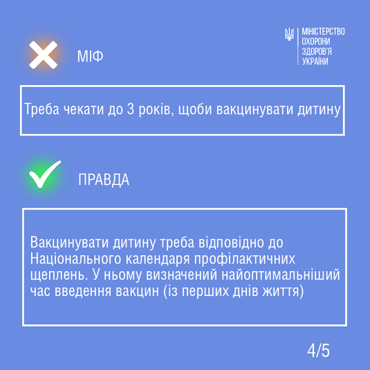 Насправді: Вакцинувати дитину треба відповідно до Національного календаря профілактичних щеплень. У ньому визначений найоптимальніший час введення вакцин (із перших днів життя) для найефективнішого захисту дитини від інфекційних хвороб. Відтак надзвичайно важливо, щоби дитина отримувала свої щеплення вчасно. Якщо ви з якихось причин пропустили вакцинацію, порадьтеся про те, як надолужити пропущені вакцини, зі своїм педіатром або сімейним лікарем.