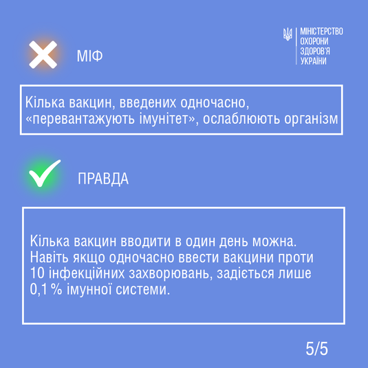 Міф 5. Кілька вакцин, введених одночасно, «перевантажують імунітет», ослаблюють організм