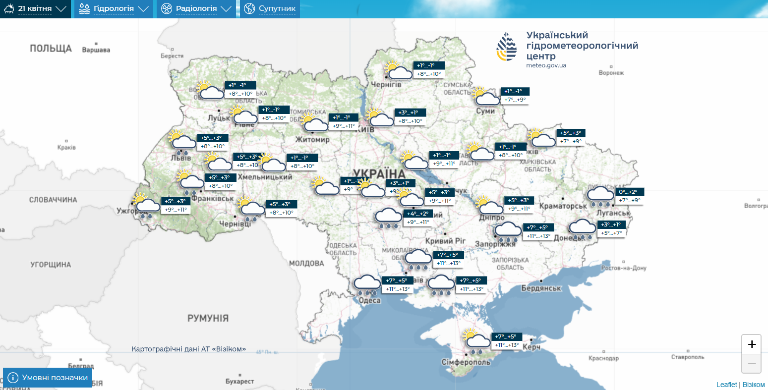 Протягом вівторка, 21 квітня, в Україні переважатиме хмарна погода з проясненнями. Вночі, окрім північної частини, а вдень у Прикарпатті, Закарпатті, південних і південно-східних областях очікуються помірні, місцями значні дощі.
