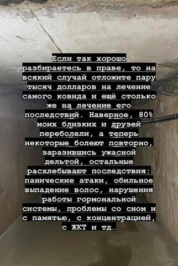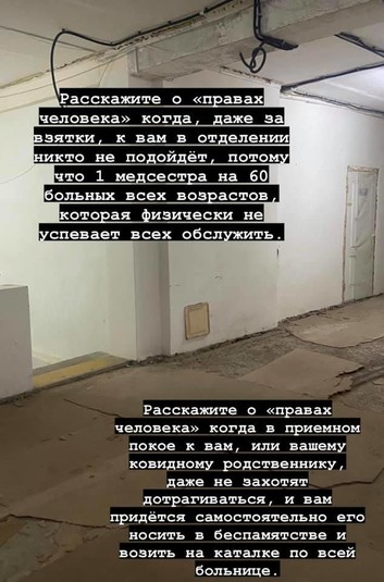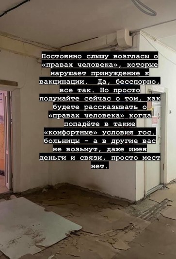«Постійно чую воплі «про права людини», які порушує примусова вакцинація. Без сумніву усе так. Але просто подумайте про це зараз, як будете розповідати «про права людини», коли потрапите у такі комфортні умови держлікарні – а в інші вас не візьмуть, навіть за наявності грошей та зв’язків, бо немає місць», – написала Алла та підкріпила свій пост промовистими фото лікарні.