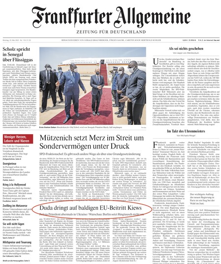 FAZ: «Дуда наполягає на якнайшвидшому вступі Києва до ЄС». Президент Польщі Анджей Дуда став першим главою іноземної держави, який виступив в українському парламенті від початку війни. Дуда назвав самооборону України «героїчним опором варварській агресії» і розповів про «тривожні голоси», які закликають Київ поступитися вимогам Росії щодо припинення війни. «Лише Україна має право визначати своє майбутнє», – сказав Дуда, обіцяючи подальшу підтримку: «Я не заспокоюся, поки Україна не стане членом ЄС».