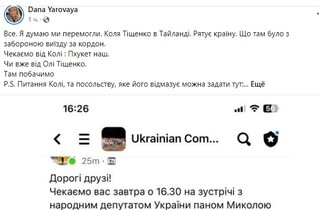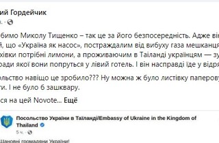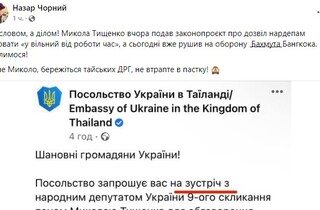 Народний депутат «Слуги народу» Микола Тищенко під час повномасштабної війни в Україні вирішив зробити добру справу і зустрітися із українським народом. Щоправда, зробити він це вирішив не деінде, а у Таїланді. У нього запланована зустріч у чотиризірковому готелі для «покращення взаємодії з представниками українського суспільства». Про це стало відомо з повідомлення на сайті Посольства України в Королівстві Таїланд.