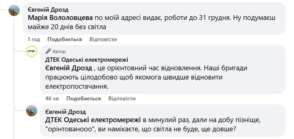 Під цим дописом одесити запитали у ДТЕК, коли їм чекати світло за окремими адресами. Деяким споживачам енергетики пообіцяли відновити електропостачання до кінця 15 грудня. «Орієнтовний час відновлення - після 20:00 15.12.2025р», – відповіли енергетики на одне із запитань мешканців Одеси.