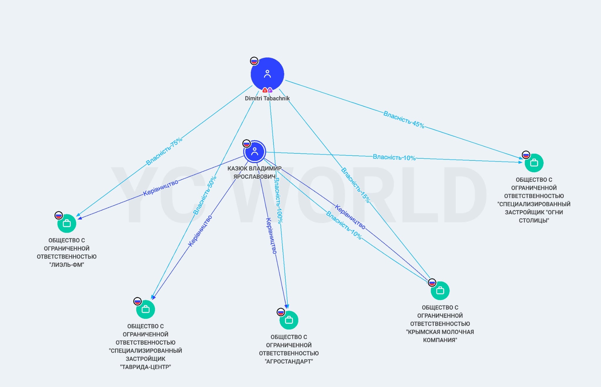 - ТОВ «Спеціалізований забудовник «Вогні столиці», де Табачник та Казюк – засновники, яким належить 45 і 10% акцій компанії відповідно. Юридично компанію зареєстрували у Сімферополі торік.