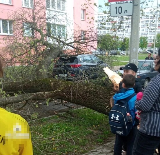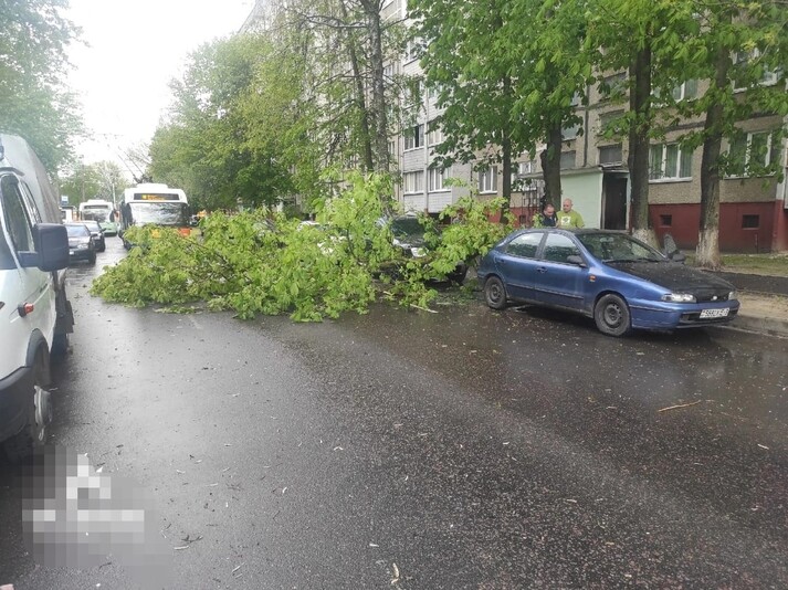 На кадрах видно, що сильний вітер повалив дерева у місті. Постраждали автівки.