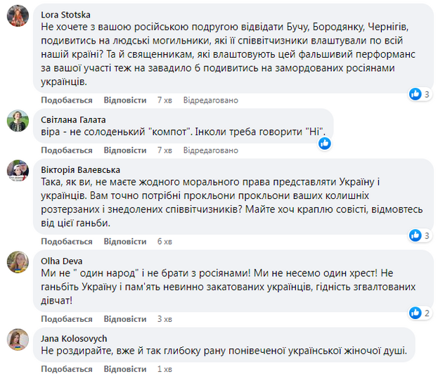 - «Не хочете з вашою російською подругою відвідати Бучу, Бородянку, Чернігів, подивитись на людські могильники, які її співвітчизники влаштували по вcій нашій країні? Та й священникам, які влаштовують цей фальшивий перформанс за вашої участі, теж на завадило б подивитись на замордованих росіянами українців».