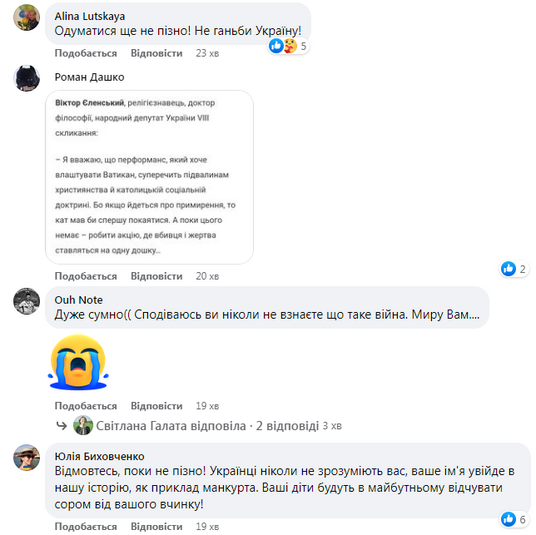 - «Ще не пізно відмовитися! Дайте стражденним українцям, яких ґвалтують, обкрадають та вбивають, хоча б відчути радість Пасхи! Не розпинайте Україну!»;