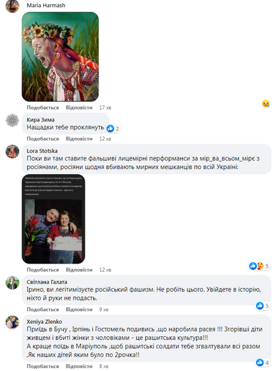 Ірині нагадали, що українці і росіяни – це різні, зовсім не братні народи: «Ми не «один народ» і не брати з росіянами! Ми не несемо один хрест! Не ганьбіть Україну і пам'ять невинно закатованих українців, гідність зґвалтованих дівчат!»