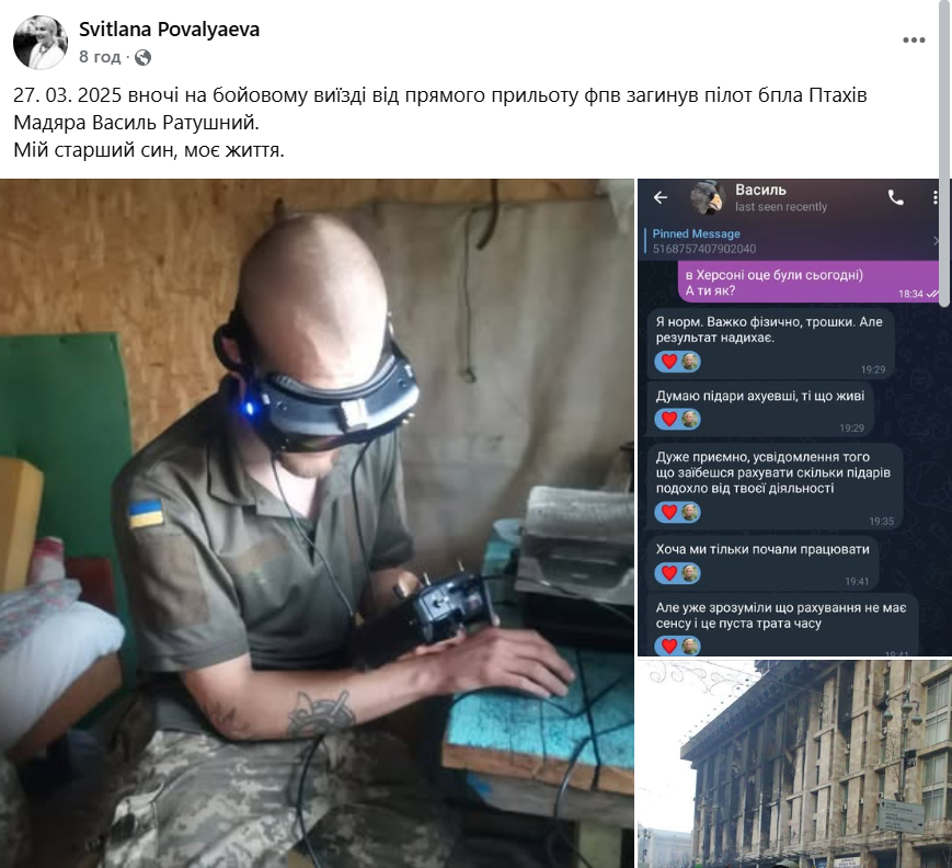 «Василь Ратушний, вікінг, старший мій син, чийого позивного я досі не знаю Гасився насмерть у найгарячіших точках Майдану. Взимку 2015-го неповнолітнім пішов воювати. У 2019-му не поновив контракт, бо понад усе прагнув жити на своїй землі і власноруч збудувати на цій землі будинок. 24 лютого 2022-го організував місцеву самооборону і пішов захищати Київ та Київщину», – розповідала про сина Світлана Поваляєва.