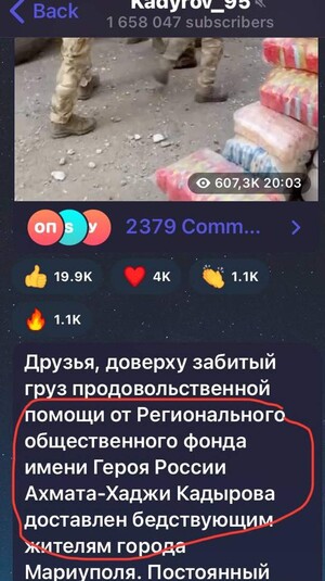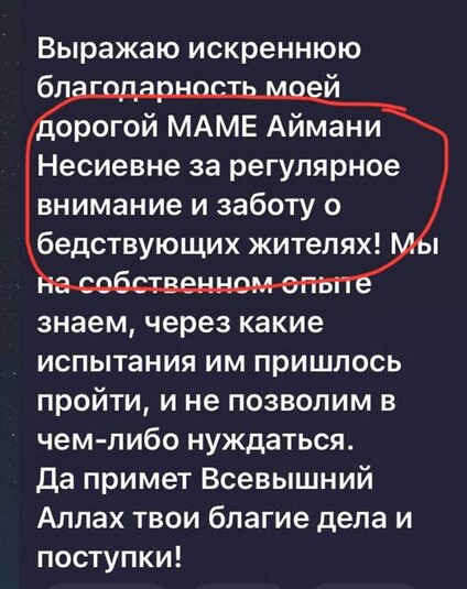 Але у дописі до відео на каналі Кадирова сказано, що ця допомога була доставлена фондом Ахмата Раджі Кадирова (батька Рамзана Кадирова) за сприяння Аймані Несіївної (матері Кадирова).