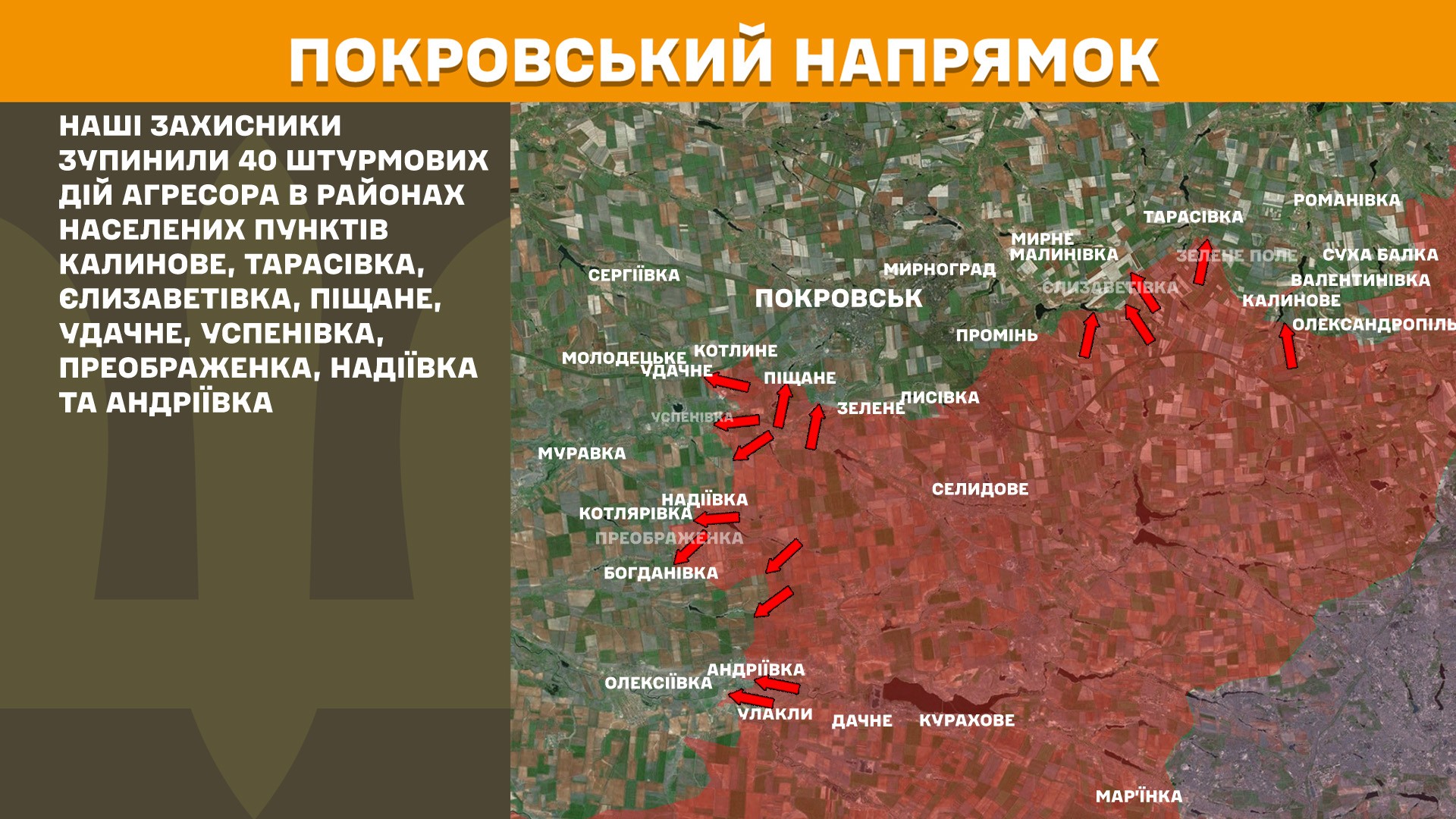Українські захисники зупинили 40 штурмових дій агресора в районах населених пунктів Калинове, Тарасівка, Єлизаветівка, Піщане, Удачне, Успенівка, Преображенка, Надіївка та Андріївка.