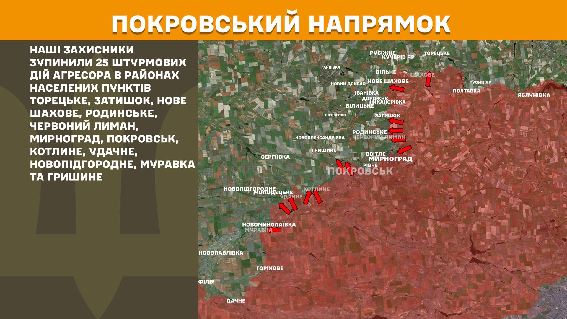 Наші захисники зупинили 25 штурмових дій агресора в районах населених пунктів Торецьке, Затишок, Нове Шахове, Родинське, Червоний Лиман, Мирноград, Покровськ, Котлине, Удачне, Новопідгородне, Муравка та Гришине.