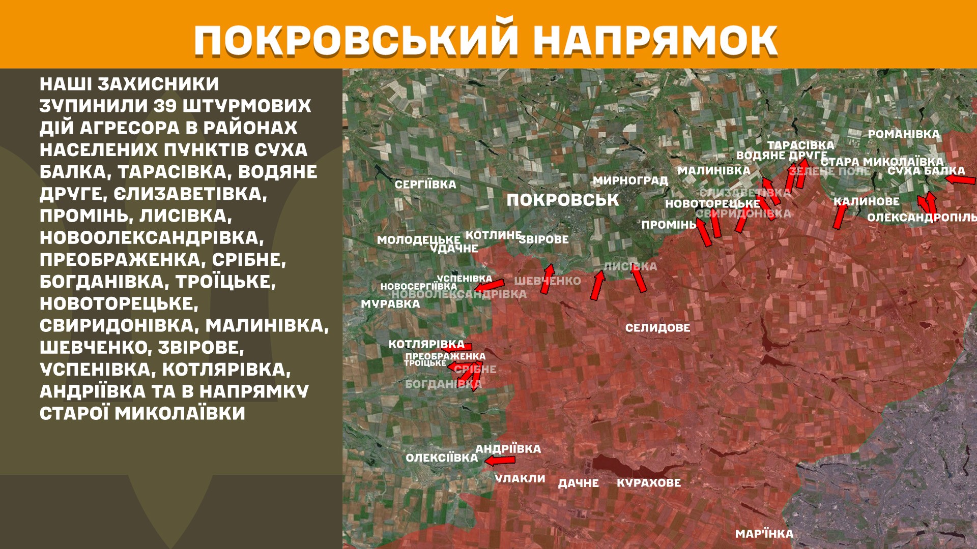 Впродовж минулої доби наші захисники зупинили 39 штурмових дій агресора в районах населених пунктів Суха Балка, Тарасівка, Водяне Друге, Єлизаветівка, Промінь, Лисівка, Новоолександрівка, Преображенка, Срібне, Богданівка, Троїцьке, Новоторецьке, Свиридонівка, Малинівка, Шевченко, Звірове, Успенівка, Котлярівка, Андріївка та в напрямку Старої Миколаївки.