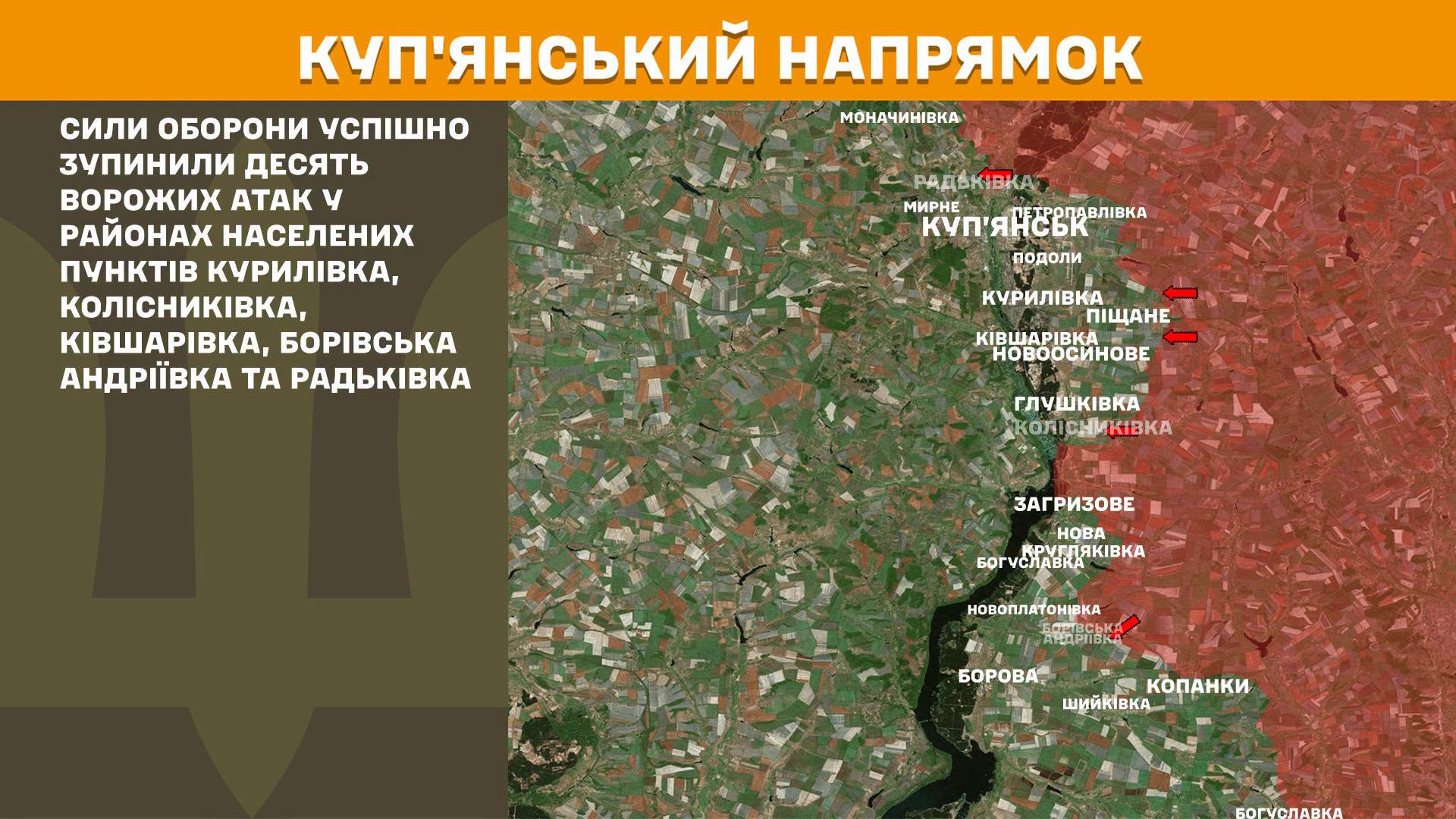 Сили оборони успішно зупинили десять ворожих атак у районах населених пунктів Курилівка, Колісниківка, Ківшарівка, Борівська Андріївка та Радьківка.