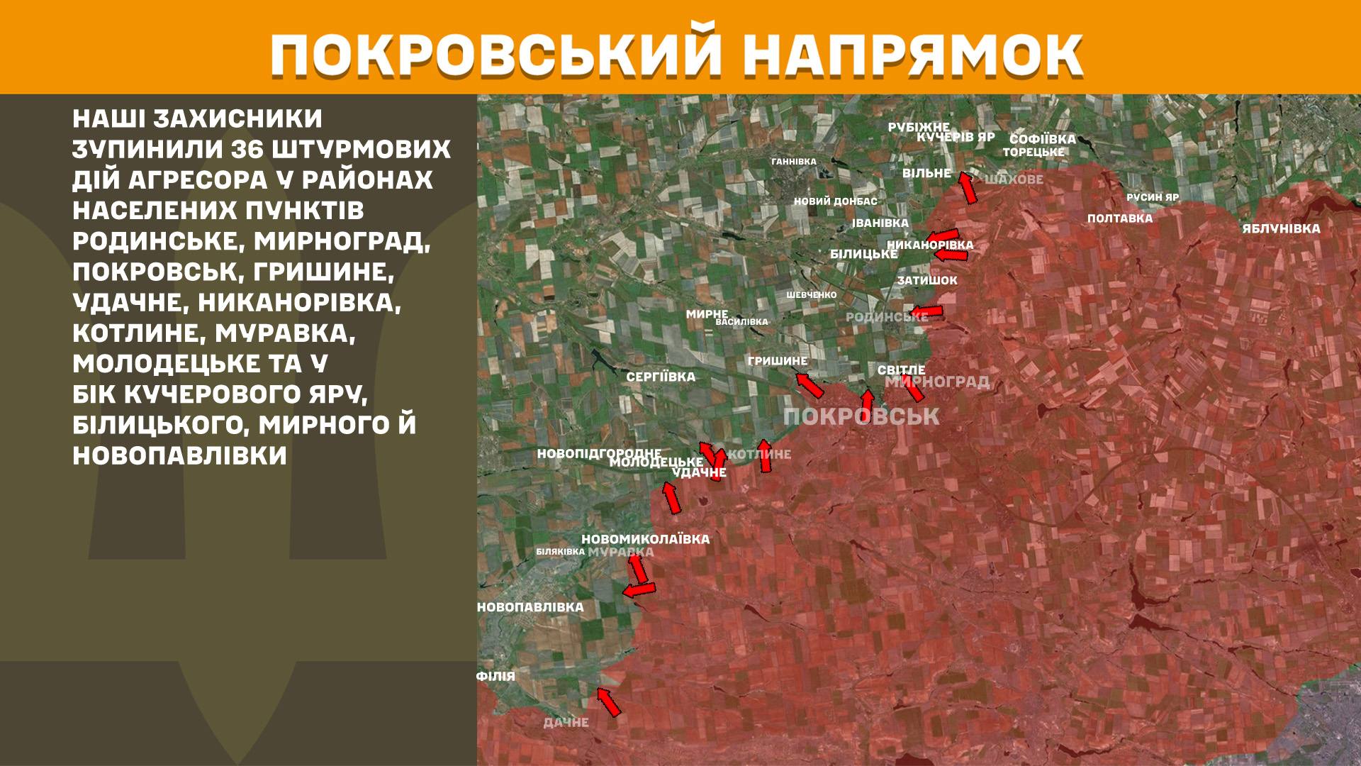 Наші захисники зупинили 36 штурмових дій агресора у районах населених пунктів Кучерів Яр, Родинське, Мирноград, Покровськ, Гришине, Удачне, Никанорівка, Котлине, Муравка, Молодецьке та у бік Білицького, Мирного й Новопавлівки.