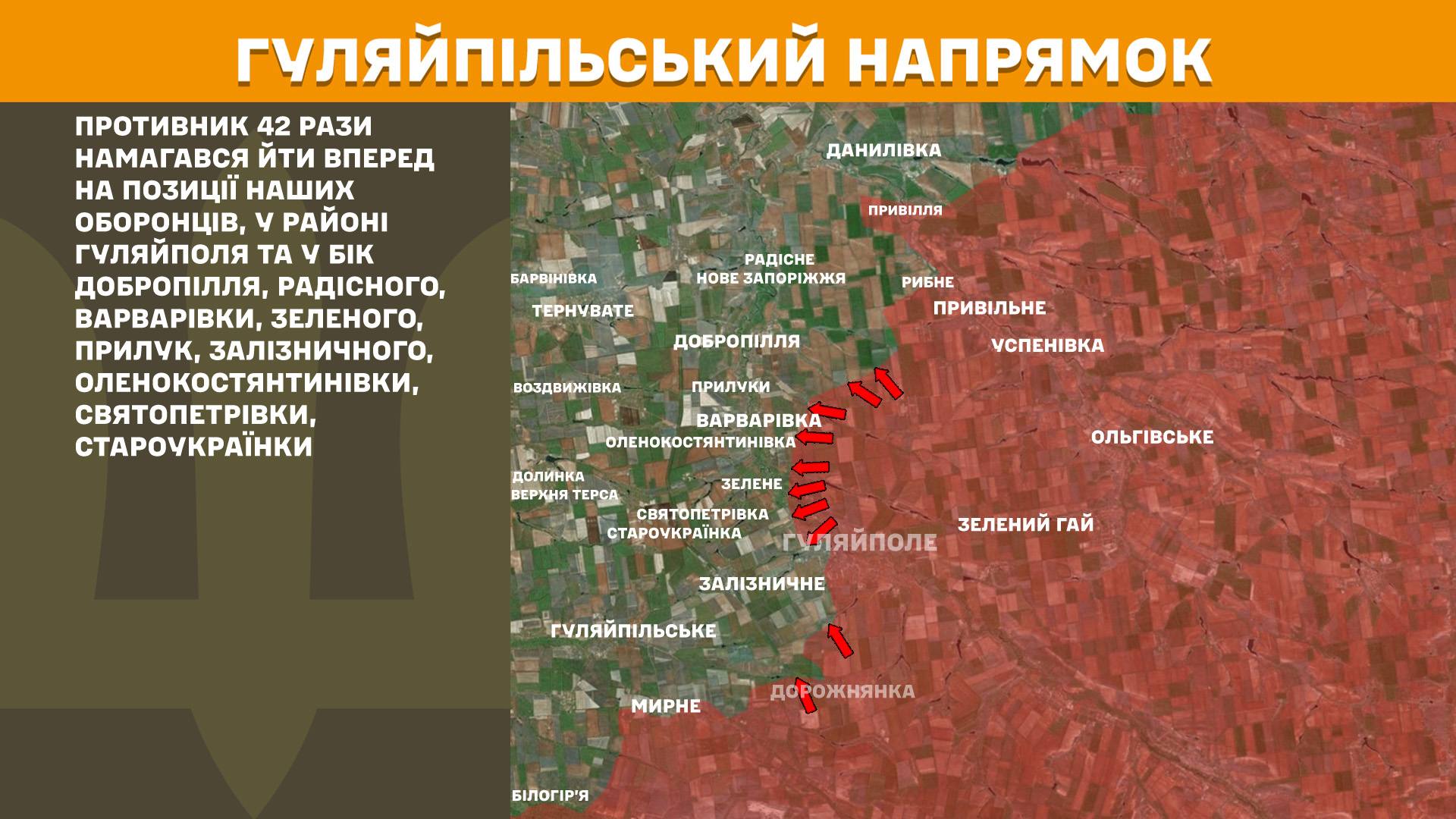 Противник 42 рази намагався йти вперед на позиції наших оборонців, у районі Гуляйполя та у бік Добропілля, Радісного, Варварівки, Зеленого, Прилук, Залізничного, Оленокостянтинівки, Святопетрівки, Староукраїнки.