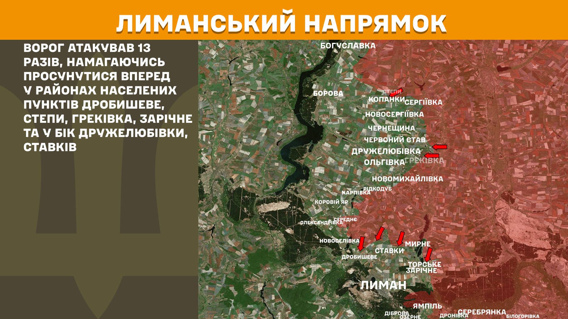 Ворог атакував 13 разів, намагаючись просунутися вперед у районах населених пунктів Дробишеве, Степи, Греківка, Зарічне та у бік Дружелюбівки, Ставків.