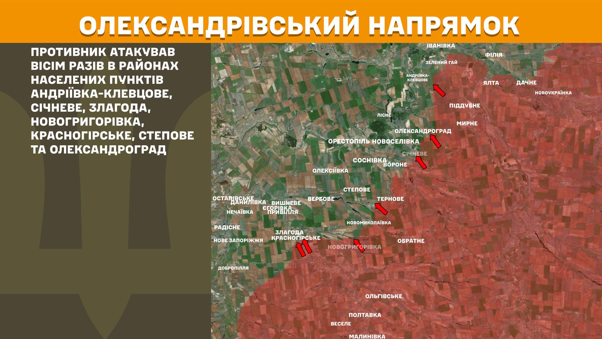 Противник атакував вісім разів в районах населених пунктів Андріївка-Клевцове, Січневе, Злагода, Новогригорівка, Красногірське, Степове та Олександроград.