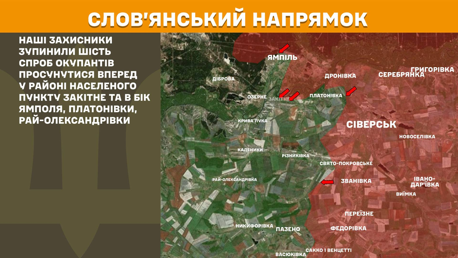 Протягом вчорашньої доби наші захисники зупинили шість спроб окупантів просунутися вперед у районі населеного пункту Закітне та в бік Ямполя, Платонівки, Рай-Олександрівки.