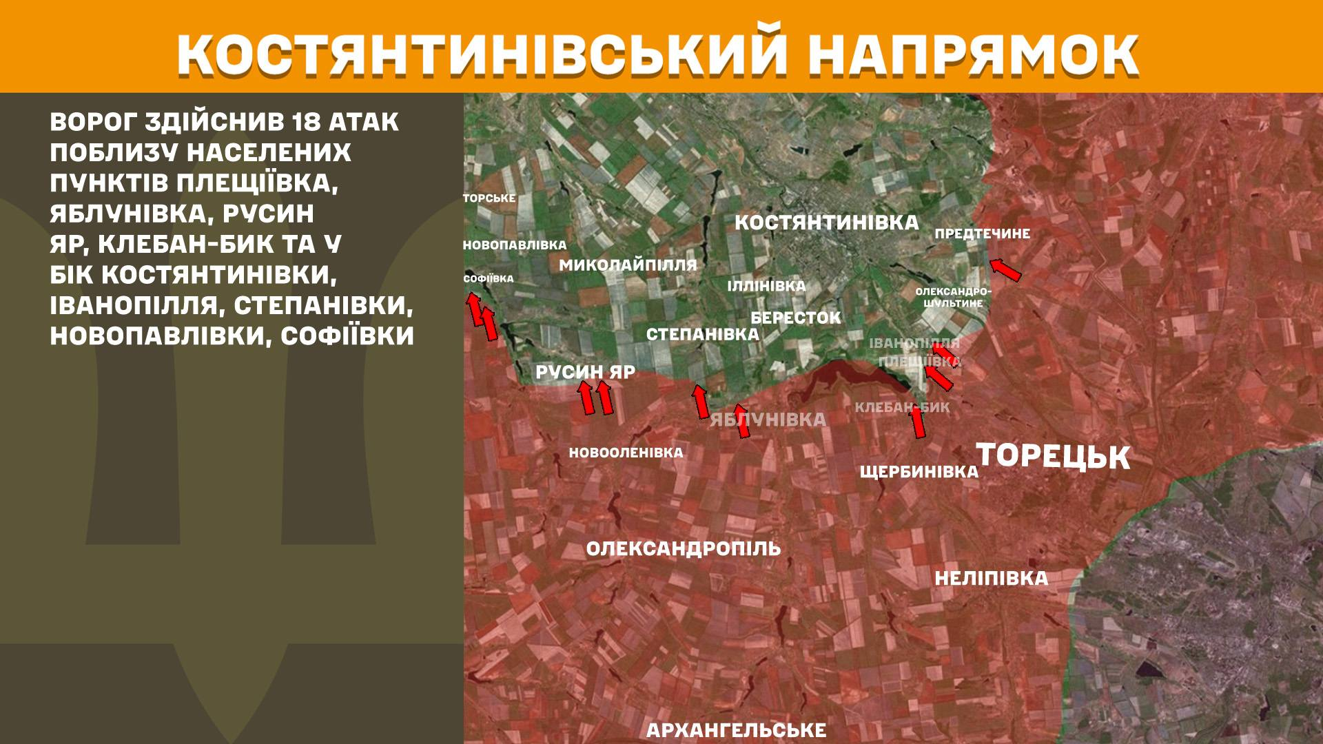 Ворог здійснив 18 атак поблизу населених пунктів Плещіївка, Яблунівка, Русин Яр, Клебан-Бик та у бік Костянтинівки, Іванопілля, Степанівки, Новопавлівки, Софіївки.