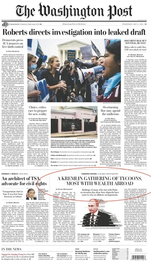 WP. Колонка: «Кремлівські збори магнатів». У той день, коли розпочав вторгнення в Україну, президент Росії Володимир Путін викликав у Кремль групу найбагатших бізнесменів своєї країни. За повідомленнями інформаційних агентств, вторгнення було «вимушеним заходом», сказав Путін групі. Посилаючись на економічні санкції, з якими вони, ймовірно, зіштовхнуться з боку Сполучених Штатів та Європейського Союзу, він додав: «Ми розуміємо світ, у якому живемо».