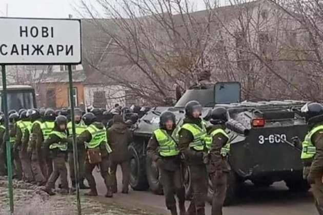 Після офіційного повідомлення Нацполіції та МВС про те, що евакуйованих справді доправлять до Нових Санжар, між протестувальниками та правоохоронцями почалися сутички.