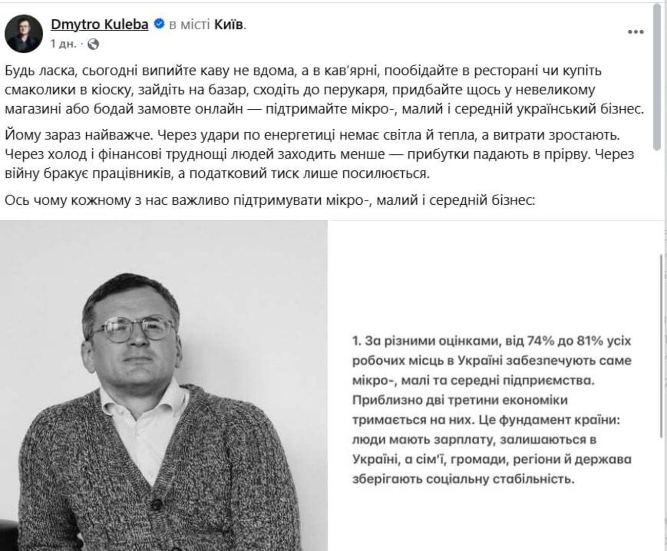 В підписі до світлини закликав українців активніше підтримувати мікро-, малий і середній бізнес під час енергетичної кризи та холодів. Він пояснив, що через російські удари по енергетиці бізнеси переживають особливо важкі часи: відключення світла й тепла підвищують витрати, холод і фінансові труднощі зменшують потік клієнтів, а нестача кадрів і податковий тиск додатково ускладнюють роботу підприємців.