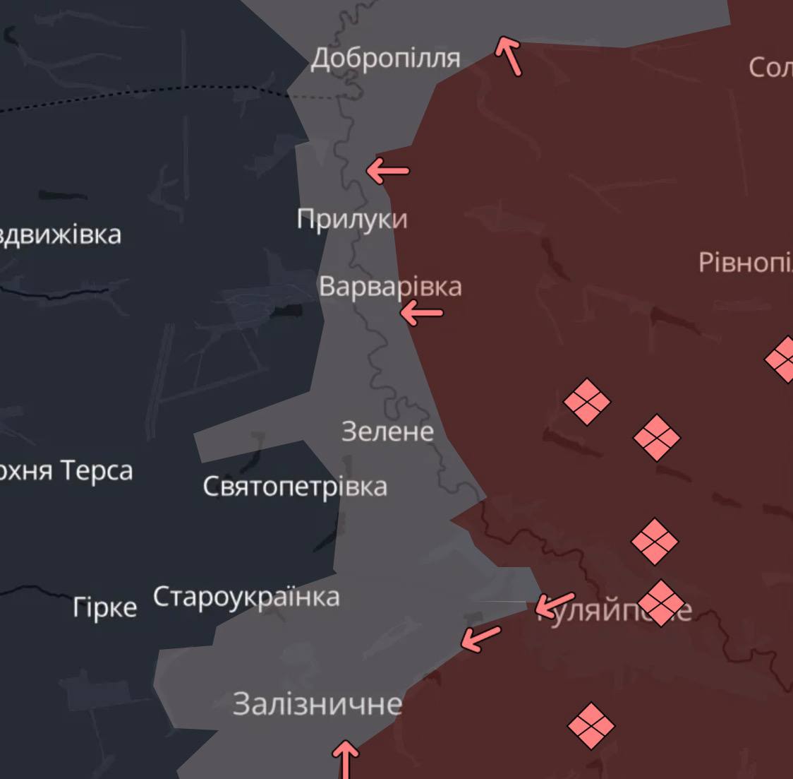 Зафіксовано 15 атак окупантів у районах населених пунктів Гуляйполе, Оленокостянтинівка, Мирне, Рівнопілля та в бік Залізничного. Три штурмові дії продовжуються.