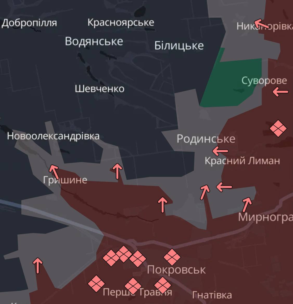 Ворог здійснив 51 атаку. Окупанти намагалися просунутися у районах населених пунктів Білицьке, Родинське, Мирноград, Покровськ, Удачне, Новопідгороднє, Молодецьке, Нове Шахове, Муравка, Горіхове та в сторону Гришиного, Філії, Новоолександрівки. Дві штурмові дії тривають.