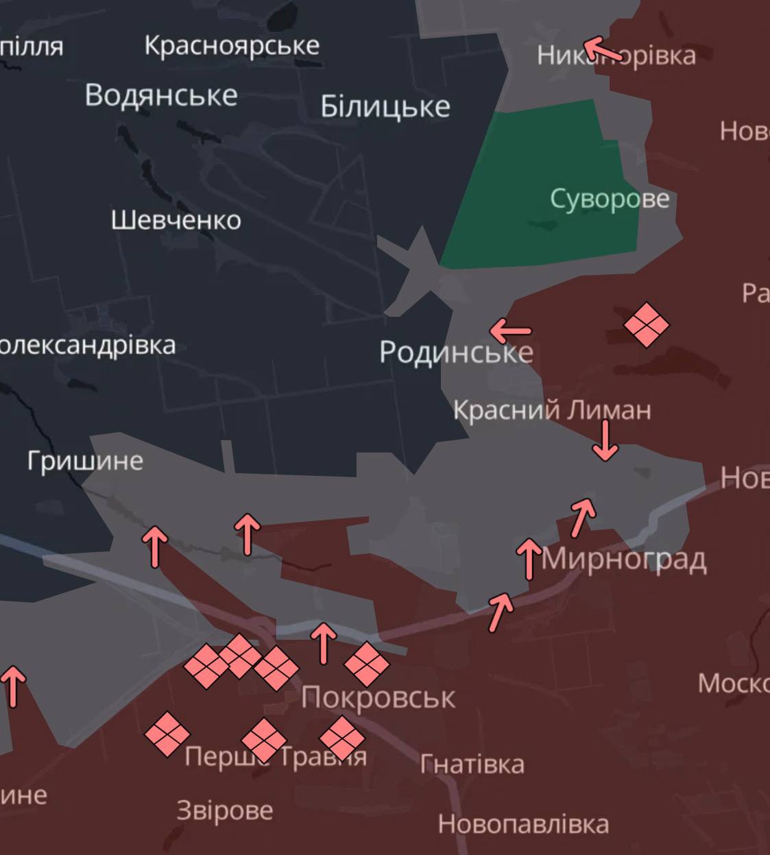 Ворог здійснив 40 атак. За уточненою інформацією, окупанти намагалися просунутися у районах населених пунктів Вільне, Затишок, Мирноград, Новоолександрівка, Родинське, Покровськ, Котлине, Удачне, Новопідгородне, Молодецьке, Дачне, Філія, Шевченко та у бік Торецького. Шість боїв досі тривають.