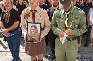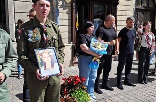Також серед містян, які прийшли попрощатися з сім'єю Базилевичів, є й донька загиблої екснардепки, мовознавиці Ірини Фаріон, Софія.
