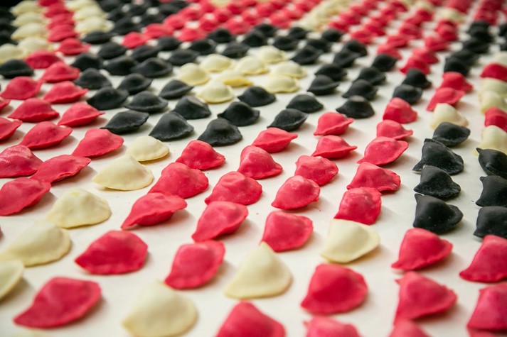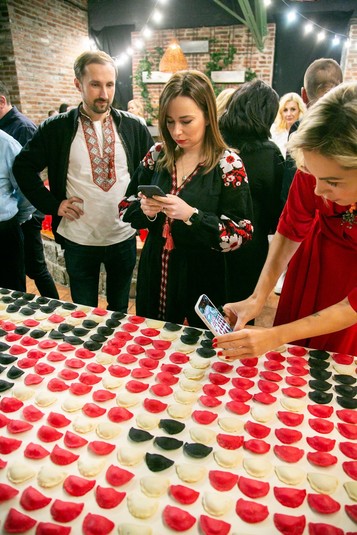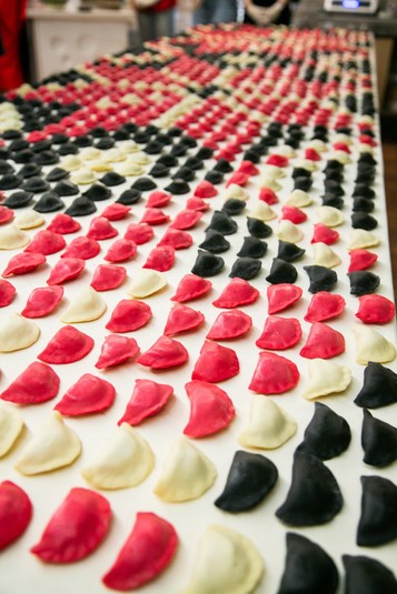 Для його виготовлення зліпили вареники трьох кольорів, традиційних для українських вишиванок – білого, червоного та чорного.