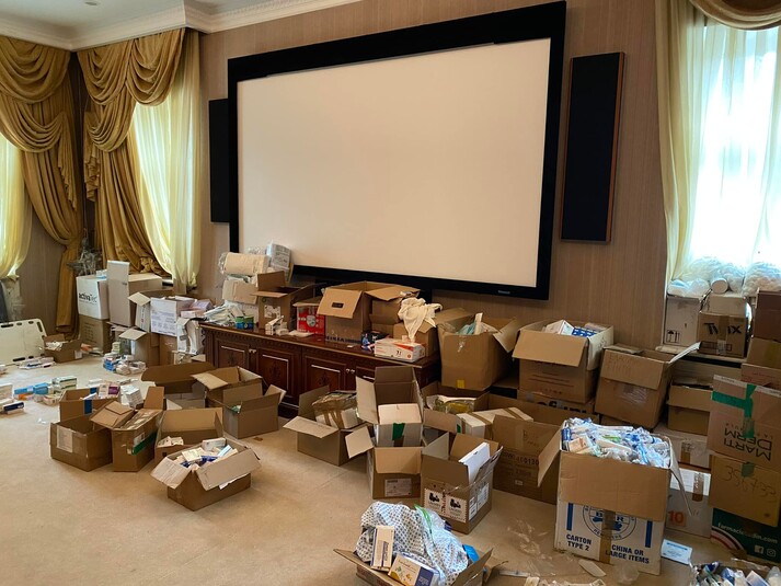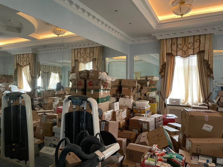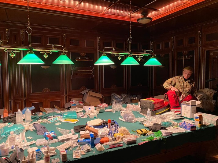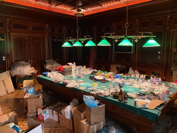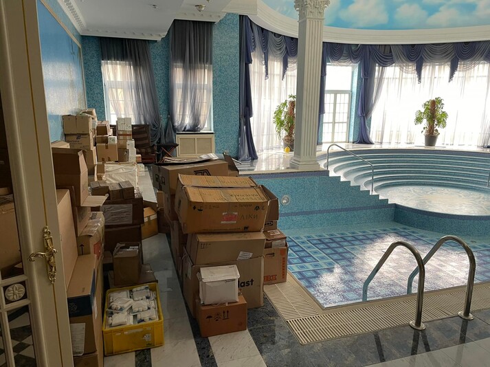 Тут з'явилися медикаменти, розкладені на більярдному столі, біля басейну – ящики з медичним устаткуванням, а у дворі – швидкі, які виїжджали для надання допомоги постраждалим від окупації міст і селищ у Київській області і продовжують виїжджати на Схід. Щоправда, щойно побиті російські війська були змушені відступити від Києва, одна зі сторін почала сумніватися у згоді. І це не військові медики.