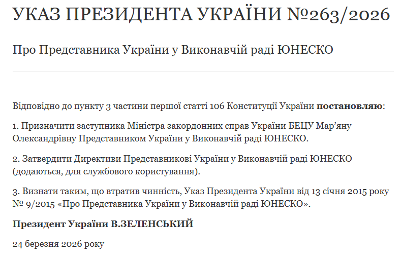 Президент України Володимир Зеленський призначив заступницю міністра закордонних справ Мар’яну Бецу представником України у Виконавчій раді ЮНЕСКО. Відповідний указ з’явився на сайті глави держави 25 березня, інформує «Главком».