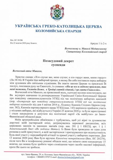Коломийська єпархія УГКЦ вже обіцяла покарати священника Миколу Мединського за його похід у депутати