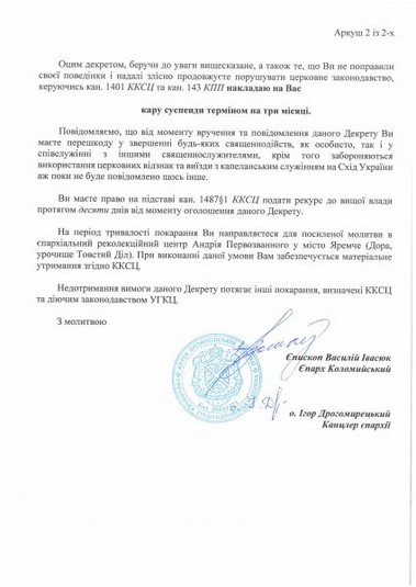 Згідно з документом, чоловіку заборонили здійснювати будь-які священнодійства терміном на три місяці.