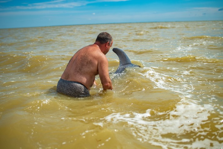 На Херсонщині врятували дельфіна, якого прибило до берега Дніпро-Бузького лиману за кілометр від села Олександрівка. Про це у Фейсбуці повідомив місцевий житель фотограф Олег Марчук.