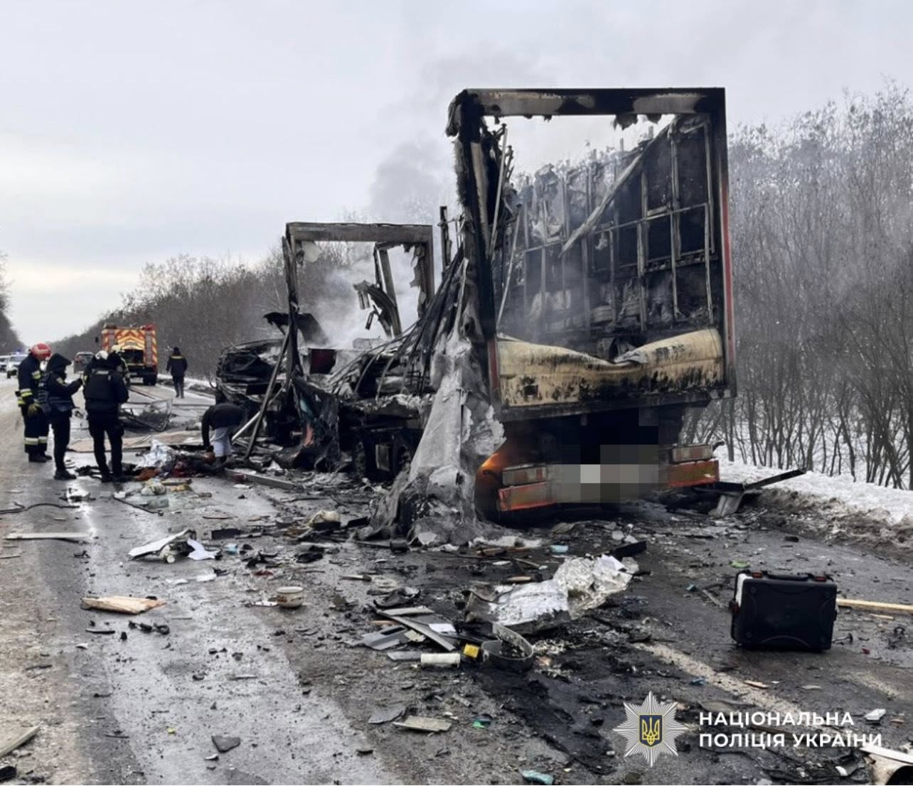 «Після зіткнення сталося загоряння автопоїзда, внаслідок чого транспортний засіб повністю знищено вогнем», – ідеться у повідомленні.
